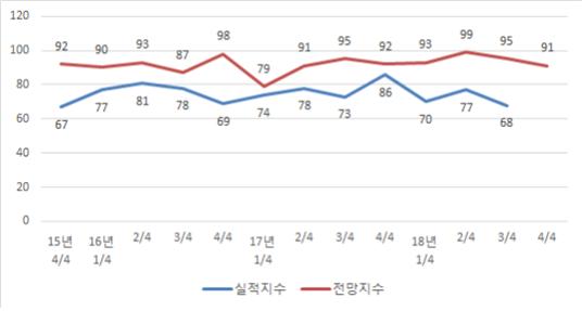 이번 조사에는 지난 분기(95) 대비 4포인트 하락, 91을 기록하며 기준치(100)를 넘기지 못하면서 2분기 연속 경기 회복에 대한 기대감이 낮아진 것으로 나타났다.