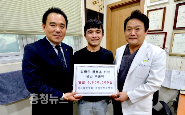 백석대학교회와 화인메트로병원은 백석대학교에서 한국어연수생으로 수학중인 키르기스스탄 출신 마마나자로프 아크바르존 씨(Mamanazarov Akbarzhon, 20ㆍ남)를 위한 수술비용을 각각 반씩 모아 지원했다.