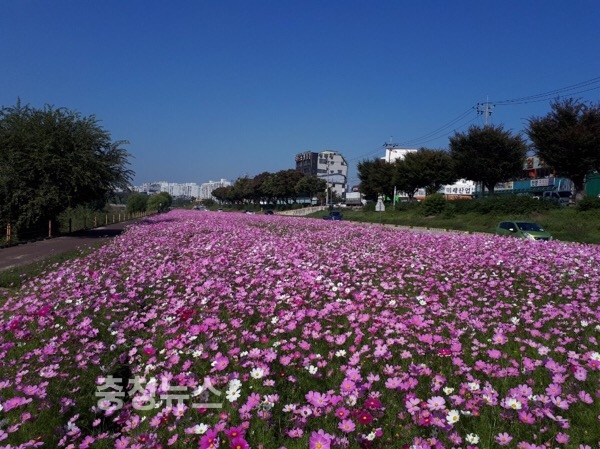 대전시가 대전천 우안 하상도로변에 조성한 코스모스단지의 꽃들이 만개해 지나가는 시민들의 이목을 끌고 있다.