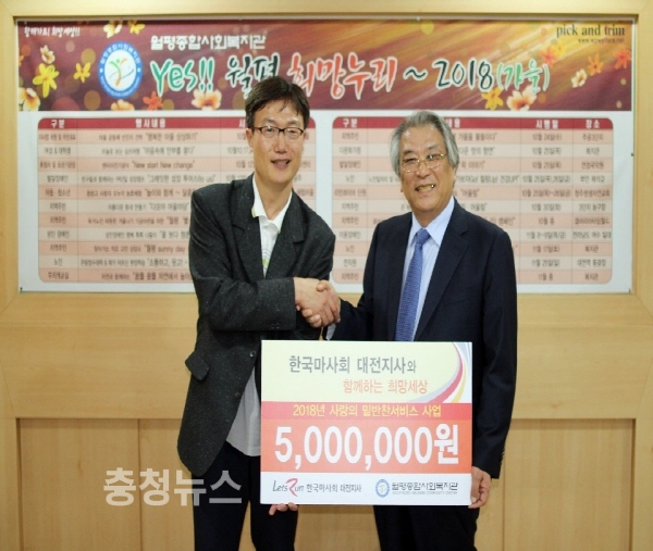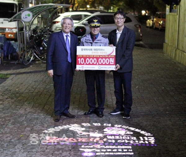 한국마사회 대전센터(센터장 장영완)는 지난 18일 “범죄 No! 안전한 행복마을 Yes!"라는 캐치 프레이즈를 내걸고 실시하는‘로고라이트 설치 사업’기부금 전달식을 가졌다.