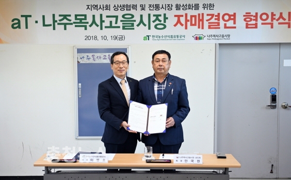 한국농수산식품유통공사(aT, 사장 이병호)와 나주시 목사고을시장상인회(회장 안국현)는 19일 자매결연을 체결했다.