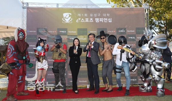 지난 19일 유림공원에서 열린 ‘제1회 유성구 대학 e스포츠대회’에서 정용래 유성구청장(왼쪽에서 다섯 번째)과 황은주 유성구 의원(왼쪽에서 네 번째)이 게임 캐릭터 코스프레 모델들과 포즈를 취하고 있다.