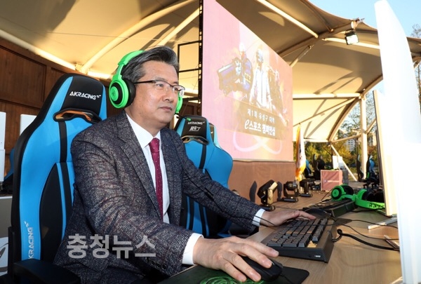 지난 19일 유림공원에서 열린 ‘제1회 유성구 대학 e스포츠대회’에서 정용래 유성구청장이 오버워치 결선에 앞서 게임 시연을 해보고 있다.