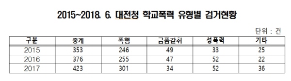 대전청의 학교폭력 검거가 2015년부터 지난해까지 증가했고, 그 중에서 폭행과 성폭력범죄가 증가세를 보이는 것으로 밝혀졌다.