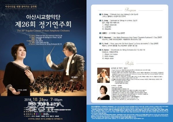 충남 아산시교향악단이 26일 여성회관 공연장에서 아산시민을 위한 제26회 정기연주회를 열고 교향악의 저변확대를 위해 무료공연을 펼친다.