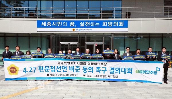세종특별자치시의회 더불어민주당 소속 17명의 의원들이 24일 시의회 정문 앞에서 화해와 평화, 번영의 새로운 한반도를 위해 ‘4.27 판문점 선언 비준 동의 촉구 결의대회’를 개최했다.