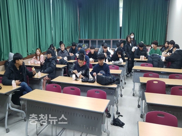 한국영상대학교(총장 유재원)가 공부하는 학생을 위한 학생행복프로젝트 ‘대학이 쏜다 - 1교시 100% 출석 강좌 수강생 간식지원’ 행사를 진행 중이다.