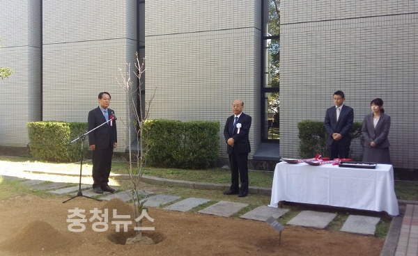 한남대-시코쿠학원대학 교류 40주년 기념식수에서 이덕훈 총장(맨 왼쪽)이 축사를 하고 있다.