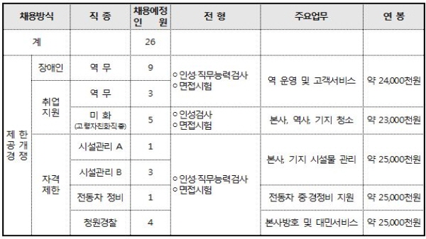 채용규모는 △역무 12명 △미화 5명 △시설관리(전기) 1명 △시설관리(설비) 3명 △전동차정비 1명 △청원경찰 4명이다.