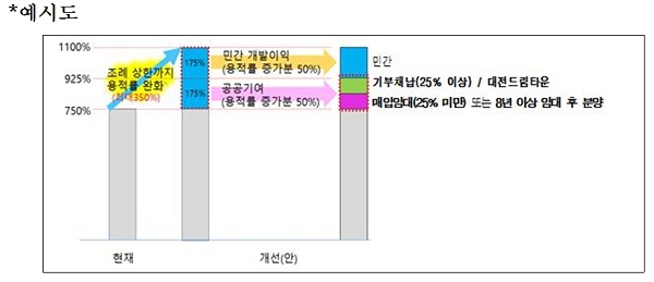 완화용적률로 발생할 개발이익금 일부에 대해 공공에 제공하는 계획을 포함해 민간 제안으로 지구단위계획을 수립할 경우, 용적률을 완화 받을 수 있으며, 앞으로 광역철도 및 도시철도 2호선 개통 상황에 따라 단계별로 확대할 방침이다.