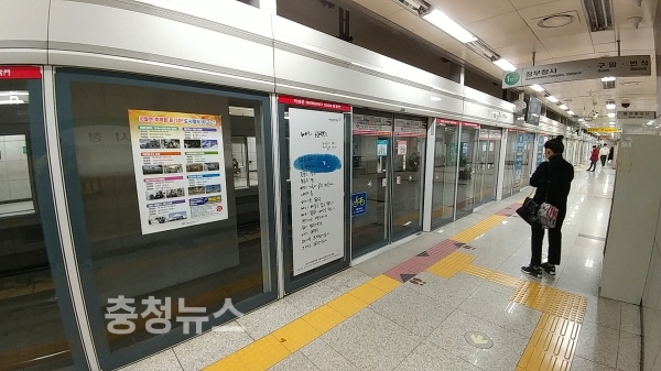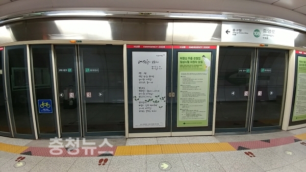 지하철 승강장 안전문에 대전문인 시화 14점 부착