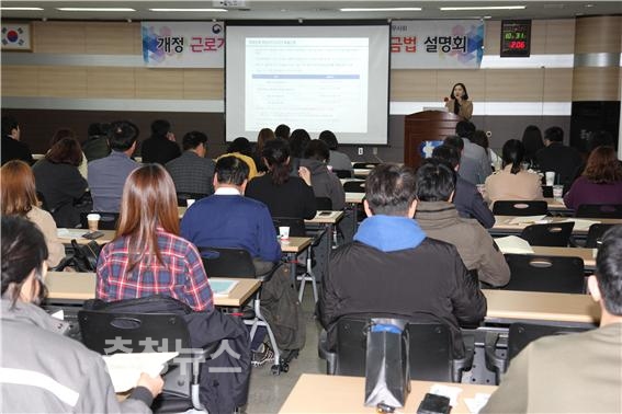 이번 설명회에서는 근로시간 단축, 연장근로 한도시간 및 유연근무제 도입 등에 관한 근로기준법 개정내용과, 내년 1월 1일 시행 예정인 최저임금법에 대해 한국공인노무사회 김진주·권영호 노무사의 상세한 설명과 현장 개별상담이 이어졌다.