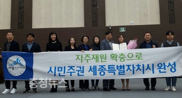 한편, 세종시 세정담당관실 직원들은 이번 연구과제 발표대회 시상식에서 ‘자주재원 확충으로 시민주권 세종특별자치시 완성’을 위한 홍보활동도 펼쳤다.