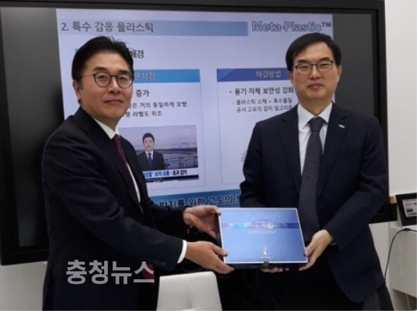 ‘특수감응 플라스틱’은 특수물질을 첨가한 플라스틱으로, 전용 감지기를 갖다 대면 소리와 진동이 울린다. 이 플라스틱으로 화장품 용기 등을 만들 경우 감지기를 활용해 정품임을 간편하게 확인할 수 있다.