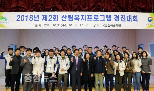김판석(앞줄 좌측 여섯 번째) 한국산림복지진흥원 사무처장이 31일 경북 칠곡군 석적읍 국립칠곡숲체원에서 열린'2018년 제2회 산림복지프로그램 경진대회'에서 참가자들과 기념촬영