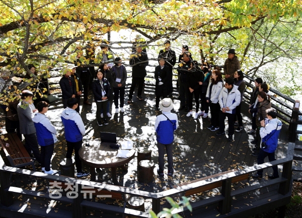 경북 칠곡군 석적읍 국립칠곡숲체원 일대에서 진흥원 직원들이 산림복지프로그램을 시연하고 있다