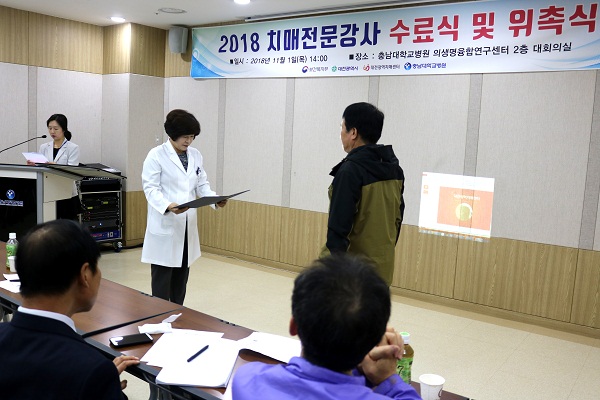 충남대병원에서 위탁 운영하는 대전광역치매센터(센터장 이애영 충남대병원 신경과 교수)가 1일 충남대병원 의생명융합연구센터 2층 대회의실에서 ‘2018년 치매 전문 강사 양성’과정 수료자 27명을 대상으로 수료 및 위촉식을 개최했다.