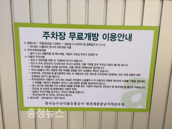 한국농수산식품유통공사 대전세종충남지역본부(aT, 본부장 이윤용)는지역민의 주차난 해소를 위해 지난 31일부터 공휴일, 주말에 사옥 1층 주차장을 무료로 개방한다.