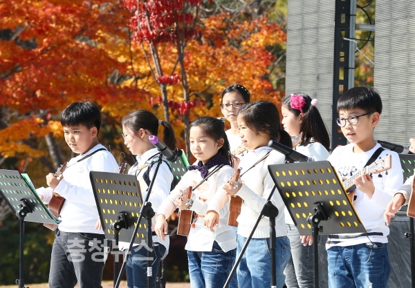 ‘2018 노은한마음축제’에서 어린이들이 우쿨렐레 공연을 펼치고 있다.