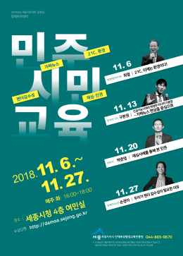 세종시(시장 이춘희)가 오는 6일부터 27일까지 매주 화요일 시청 여민실에서 11월 정책아카데미 ‘민주시민교육’ 특별강연을 진행한다.