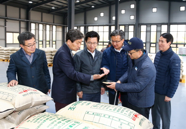 6일 유성농협신창고에서 진행된 2018년산 공공비축 미곡 매입 현장에서 정용래 유성구청장(오른쪽에서 세 번째)과 허태정 대전시장(왼쪽에서 세 번째)이 쌀 상태를 확인하고 있다.