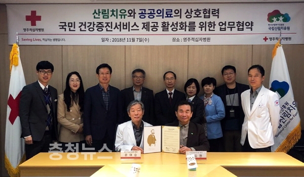 산림청 한국산림복지진흥원(원장 윤영균)은 지난 7일 국립산림치유원(원장 고도원)이 경북 영주시 대학로 영주적십자병원(원장 윤여승)에서 ‘산림치유와 공공의료의 상호협력을 위한 업무협약(MOU)’을 체결했다고 8일 밝혔다.