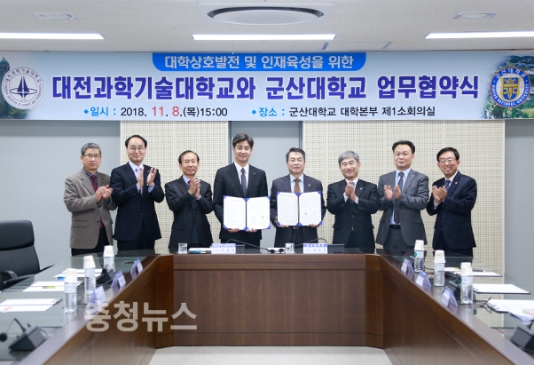 대전과학기술대학교(총장 이효인)는 8일 오후 군산대학교 대학본부 제1소회의실에서 군산대학교(총장 곽병선)와 상호 협력 및 발전을 위한 업무협약 체결식을 거행했다.