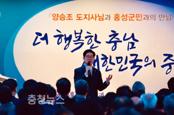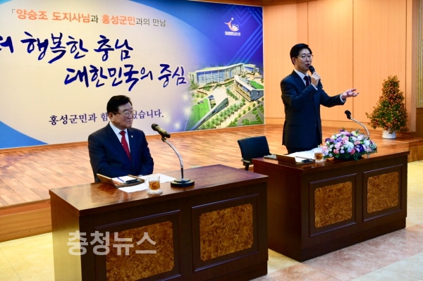 9일 300여 홍성군민들이 참석한 가운데 홍성군청 대강당에서 개최된 양승조 도지사 방문에서 김석환 군수는 ‘복지수도 충남’ 건설을 천명하고 저출산, 고령화, 사회양극화 등 3대 위기 극복에 노력하는 양승조 지사에게 경의를 표하고 홍성군 현안 해결을 위해 노력해 줄 것을 건의했다.