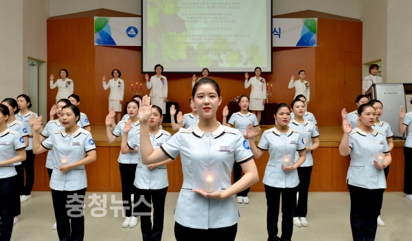 이날 예비치과위생사 선서식에는 54명의 치위생학과 2학년 학생들이 참석해 임상실습에 나서기 전 인류 봉사의 책임과 의무를 다할 것을 다짐했다.