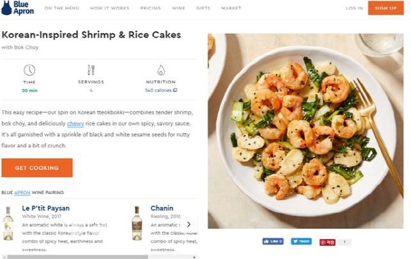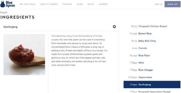 블루에이프런은 2012년에 창립되어 밀키트 서비스를 개척한 스타트업 업체이자, 시장점유율이 30%에 달하며 매달 200만 이상 가구에 식재료를 배달하는 업체로, 금번 한국메뉴 런칭에서는 고추장, 쌀떡을 이용한 퓨전 메뉴를 선보이며 한국식재료 소비확산에 나선다.