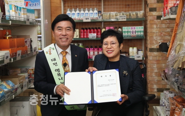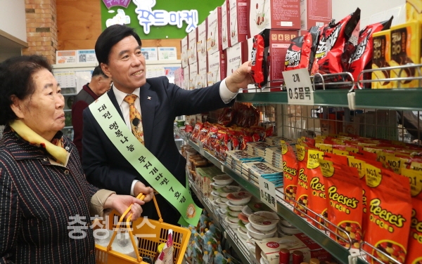 황인호 대전 동구청장이 13일 판암동에 위치한 대전행복나눔 무지개 푸드마켓 7호점에서 일일 명예점장 체험을 하고 있다.