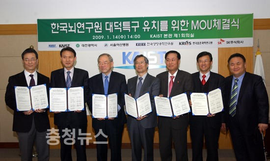 '한국 뇌연구원' 대덕특구 유치를 위해 대전시와 5개 기관이 상호 협력할 전망이다. 14일 오후 KAIST에서 김홍갑 행정부시장 서남표 KAIST 총장, 이정신 서울아산병원원장, 박영훈 한국생명공학연구원장, 김명수 한국표준과학연구원장, 박영호 SK주식회사 사장이 '(가칭)한국 뇌 연구원 대덕특구 유치를 위한 MOU'를 체결했다.