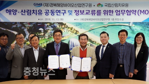산림청 한국산림복지진흥원(원장 윤영균)은 지난 13일 국립산림치유원(원장 고도원)이 경북 울진군 죽변면 (재)경북해양바이오산업연구원(원장 김태영)에서 이 기관과 ‘산림·해양치유연구 활성화를 위한 업무협약(MOU)’을 체결했다.