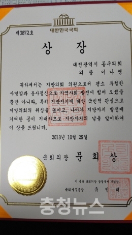 이나영 대전시 동구의회 의장이 지난 달 29일 제6회 지방자치의 날을 맞아 지방의회와 지방자치 발전 유공으로 영예의 국회의장상을 수상했다.
