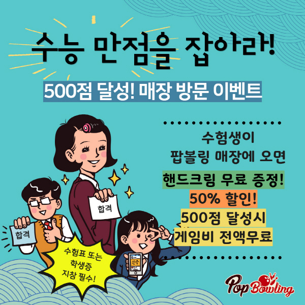 참여를 원하면 이벤트 기간 내 수험표 또는 학생증을 지참 후 전국 팝볼링 매장을 방문하면 된다. 해당 수험생이 포함된 팀 중 1인 이상 개인 3게임 합산 정확히 500점을 달성하면, 게임비 전액 무료 혜택과 전원 핸드크림(1인 1개) 증정의 혜택이 제공된다. 단, 500점을 초과하면 당첨 대상이 아니니 주의해야 한다.