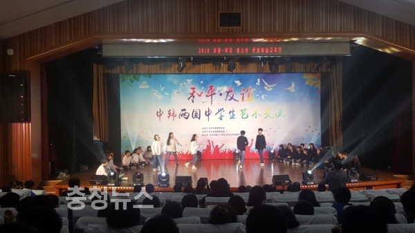 북경시 18학교 강당에서 북경시 학생들과 합동 문화예술 공연을 펼쳤다.