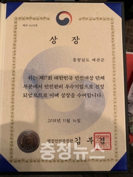 충남 예산군은 16일 서울 중구 한국프레스센터에서 열린 ‘제17회 대한민국 안전대상’ 시상식에서 화재 재난 예방에 노력한 공로를 인정받아 단체상 부문 특별상(행정안전부 장관상)을 수상했다고 밝혔다.