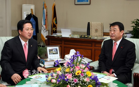 ▲ 박성효 시장 동구청 연두방문 이장우 청장과 환담을 나누고있다.