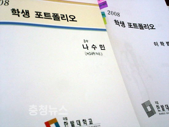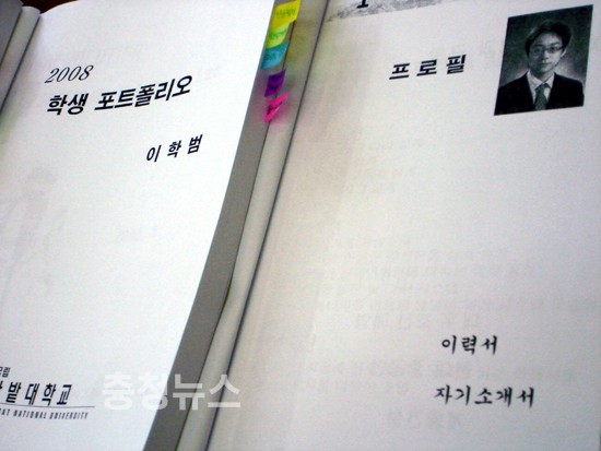 본인의 성적과 그간의 상담 내역, 현장실습일지를 비롯한 자격증, 외국어 공부 흔적 등 본인을 홍보할 수 있는 모든 것을 총망라해 한권의 두꺼운 책을 만듭니다.
