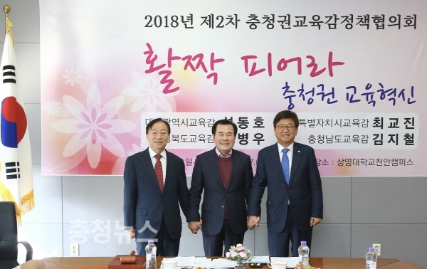 세종시교육청(교육감 최교진)은 17일 상명대학교(총장 백웅기) 천안캠퍼스에서 충청권 4개 교육청(세종․대전․충북․충남) 교육감이 참석한 가운데 ‘2018 제2차 충청권교육감정책협의회’를 가졌다.