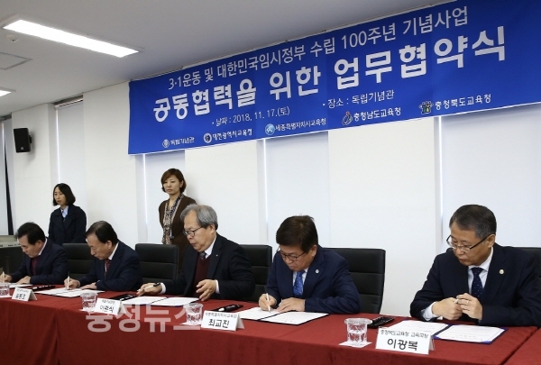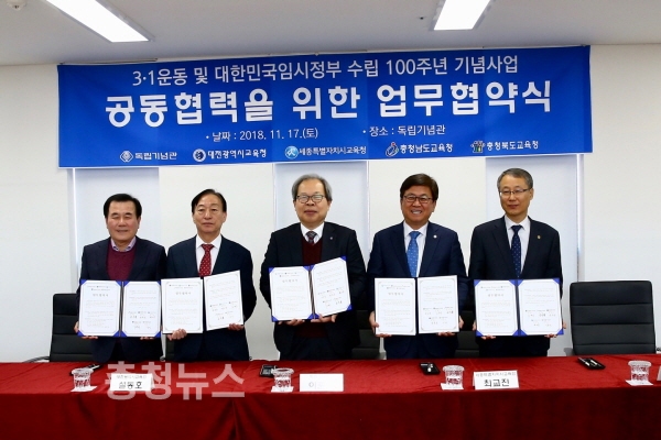 대전·세종·충남·충북 시‧도교육청은 17일 독립기념관(관장 이준식)과 함께 ‘3·1운동, 임시정부 수립 100주년’ 공동 사업을 진행하기 위한 업무협약을 체결했다.