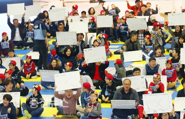 17일 유성구 주최로 카이스트에서 열린 제6회 전국 꿈나무가족 과학골든벨에 참석한 200팀의 참여 학생들이 과학문제를 듣고 답판을 들어 보이고 있다