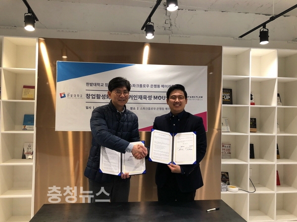 이 협약은 한밭대 창업보육센터(센터장 김건우)와 스파크플로우 메이커흥신소((주)다른코리아 운영, 은행동 소재)가 창업활성화 및 메이커문화 확산에 상호협력하기 위해 마련됐다.