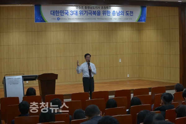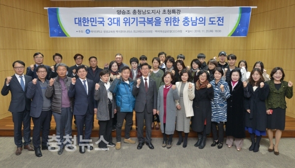 백석대학교(총장 장종현)ㆍ백석문화대학교 평생교육원은 20일 교내 글로벌외식관 5층 세미나실에서 양승조 충청남도지사를 초청해 ‘대한민국 3대 위기극복을 위한 충남의 도전’이라는 주제로 특강을 진행했다.