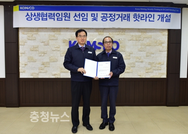 22일 협력기업과의 공정거래 문화 조성과 상생협력을 통한 사회적 가치의 실천을 위해 정상윤 기획이사를 상생협력임원(CCO, Chief Cooperative Officer)으로 선임하고, 공정거래 핫라인을 개설했다. 사진 왼쪽 조용만 조폐공사 사장, 오른쪽 정상윤 상생협력임원>