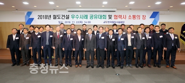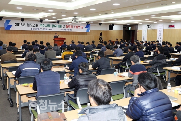 한국철도시설공단(이사장 김상균)은 올 한해 전국 320여개 모든 철도건설현장을 대상으로 재난·안전·품질 사례를 공모해 15건의 우수사례를 포상하고, 이를 공유하는 ‘철도건설 우수사례 공유대회 및 협력사 소통의 장’을 임직원 및 협력사 관계자 160여명이 참석한 가운데 지난 22일 철도공단 본사에서 개최했다고 밝혔다.