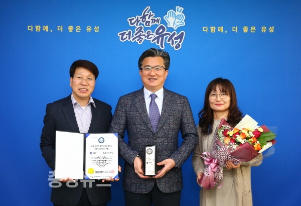 ‘제11회 대한민국 인터넷 소통대상’에서 대전 유성구가 기초자치단체부문 대상을 수상한 후 구청 행복사랑방에서 정용래 유성구청장(가운데)과 송호현 유성구 홍보실장(왼쪽), 유혜경 유성구 홍보실 홍보담당(오른쪽)이 상패를 들고 기념촬영