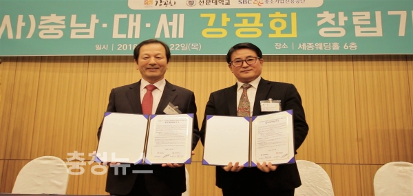 이날 ‘(사)충남∙대∙세 강공회’는 선문대, 충남테크노파크, 대전충남 대한무역투자진흥공사(KOTRA), 충남경제진흥원과 상호협력 증진을 위한 협약을 체결했다. 이들은 지역발전에 시너지 효과를 발휘할 수 있도록 상호 간 적극 지원하겠다고 밝혔다.