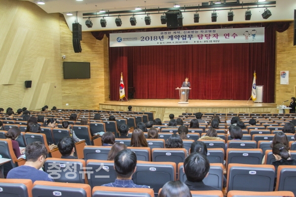 세종시교육청(교육감 최교진)은 28일 세종시교육청 2층 대강당에서 본청 및 직속기관, 관내 유·초·중·고 계약담당 150명을 대상으로 「2018년 계약업무 담당자 연수」를 실시했다고 밝혔다.