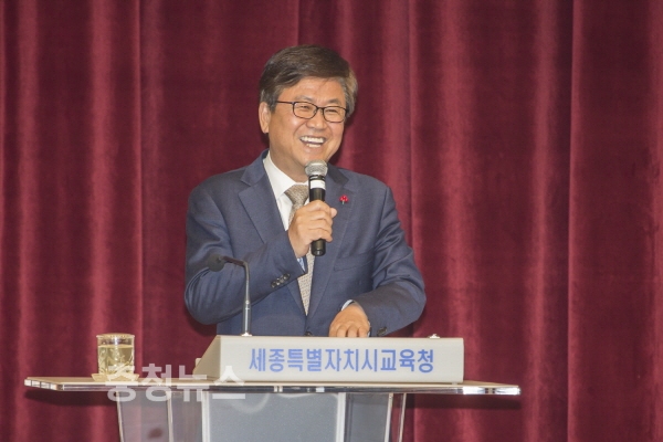 28일 세종시교육청 2층 대강당에서 진행한 연수 장면과 최교진 교육감의 인사말 장면